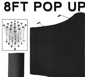 Features:Large carrying case keeps everything in order and room-saving storage.Not recommended but the case can be used as a temporary podium if urgency.Durable wheels on the carrying case provides unlimited moving.3 position lock Handle for any height mobility.8'x 8' aluminum pop up frame extends in seconds.Velcro-Receptive Black Fabric Panels for black display board or velcro banners.Magnetic Channel Bars for very convenient setting up or dismantling.Halogen Spotlights for particular focus or atmosphere building.Two bulbs for spare as Free Gift.Each part of the display is well designed for quick and convenient setting up.Sizes:Fabric Panel for Center: 90-1/2" H x 27-1/2" WFabric Panel for Side: 90-1/2" H x 26-3/8" WMagnetic Bar: 27-1/2" LDisplay Board(Approximated): 8' H x 8' WPackage Includes:1x Aluminum Pop Up Frame3x Fabric Panels for Center2x Fabric Panels for Side18x Magnetic Connecting Bars2x Halogen Spotlights with bulbs2x Halogen Bulbs for Spare1x Carrying Case with Wheels and Handle1x Instruction for Installation (For general models)Installing Steps:Get all the parts out of the caseSet up the pop up frame in secondsFix the bars by pushing up the pointed end to the recess vertically and push the opposite end to the socket horizontallyHang the 3 Center Fabric Panels onto the middle of frame by fixing the plastic hooks to the screws on the top of the frameSmooth the edges where magnetic attraction effectedHang the 2 Side Fabric Panels onto the both sides of the frame in the same wayFix the halogen spotlight to the top